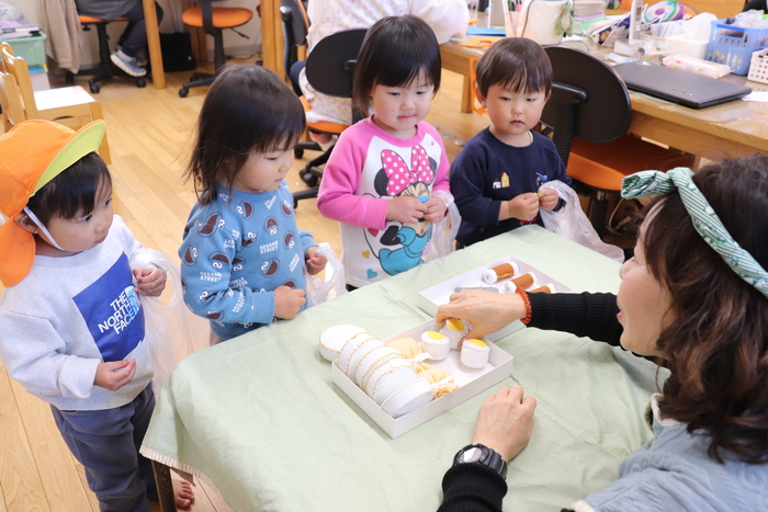 お店は職員室・・・お友だちが買いに来ましたよ。 「ちくわくださ~い」 「はいよっ、100円で~す!」 いなせな!?店員さんが相手をしてくれます。(笑) 何を買ったか、お家で聞いてあげてくださいね。 | ||