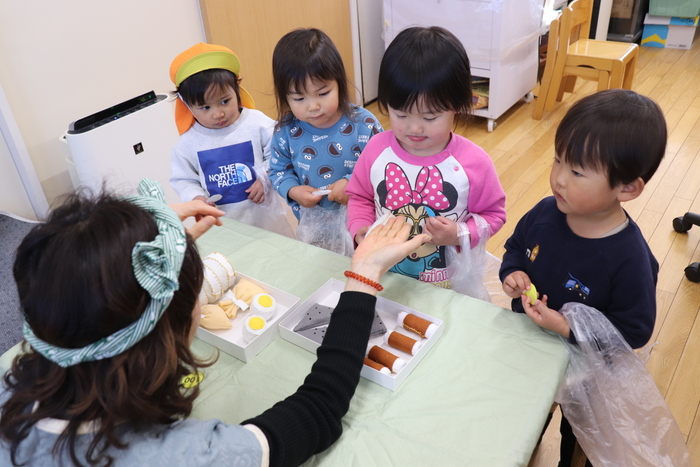 < 1月 9日「おでん屋さんごっこ」> れんげ組さんがおもしろいごっこ遊びを始めましたよ・・・「おでん屋さんごっこ」で~す! さてさて、どんなネタがあるか分かりますか~???(笑) | ||