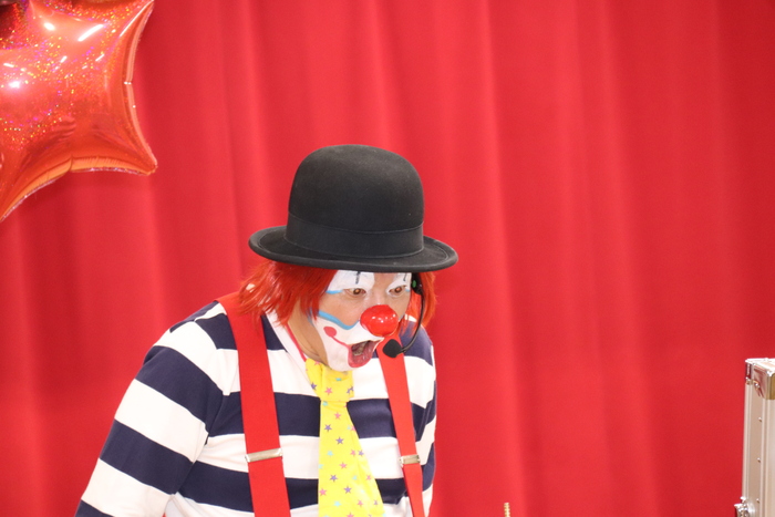 バルーンアートといえば・・・BBさん!! 登場からお友だちをじらすんですよねえ。(笑) 幕の下から、大っきな足をのぞかせて・・・それに気づいたお友だちは大騒ぎ!! | ||