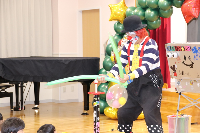一本の棒の風船を、キュッキュッキュッとひねっていくと・・・あっという間に作品ができあがります。 その手さばきの鮮やかさに、お友だちは見惚れてしまいます! | ||