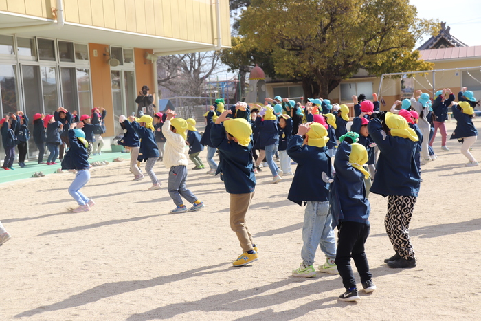 < 2月 6日(金)「マラソンごっこ」> 昨日から「マラソンごっこ」が始まりました。 走る前に行うのが、今月の体操(踊り)「だ・る・ま・さんがおどった!」です。 今月もアップテンポな踊り! マラソンの前の準備運動にふさわしいです。 | ||