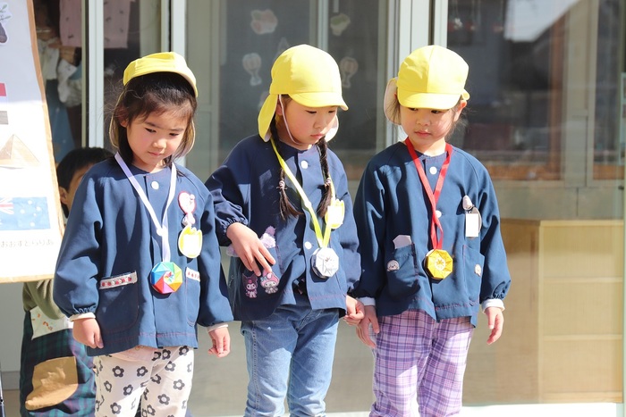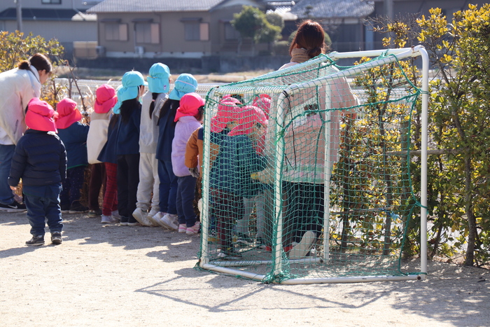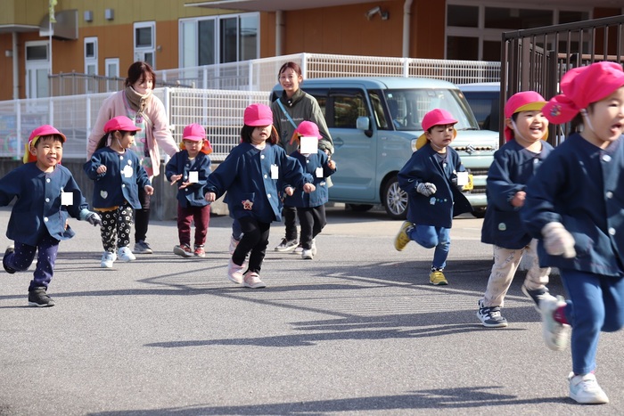 走り終わったらクイズ! 今年のテーマは「せかいりょこう」! この陰には何が隠れてるかな?? 「パンダ、パンダ!!」即答です!(笑) このあとお部屋でマラソンカードにシールを貼って、今日のマラソンごっこはおしまい。 しばらく寒い中での体力作りが続きます。 | ||