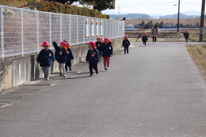 自分の選んだ色のだるまさんに並びます。 さあ、スタート! 園外へ出かけます。 (下左)「赤だるま」は「テニスコートコース」へ。 (下右)「青だるま」は「おうちコース」です。 | ||