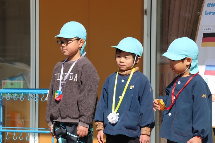 レースのあとは表彰式。 オリンピックと同じ金メダル、銀メダル、銅メダルです。 みんなよく頑張ったね。 ちなみに全員完走のマラソン大会でした! | ||