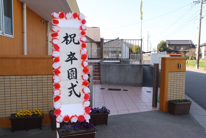 < 3月24日(火)「卒園式」> 春爛漫!! 卒園式です!! こんなふうにすみれ組のお友だちとお家の方をお出迎え。 ・・・式場内の様子は写真に撮れませんから、外観で勘弁してください。(苦笑) | ||
