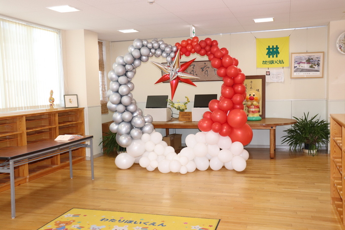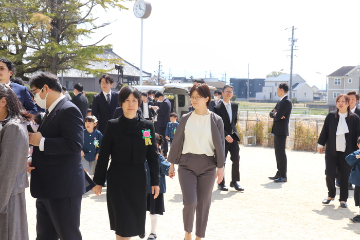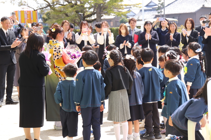 式が終わり・・・花道も終わり・・・。 最後は園庭で三々五々団らんを! 担任の先生にもプレゼント! ご卒園おめでとうございました!! すみれ組のみんな、小学校へ行ってもがんばってね。 | ||