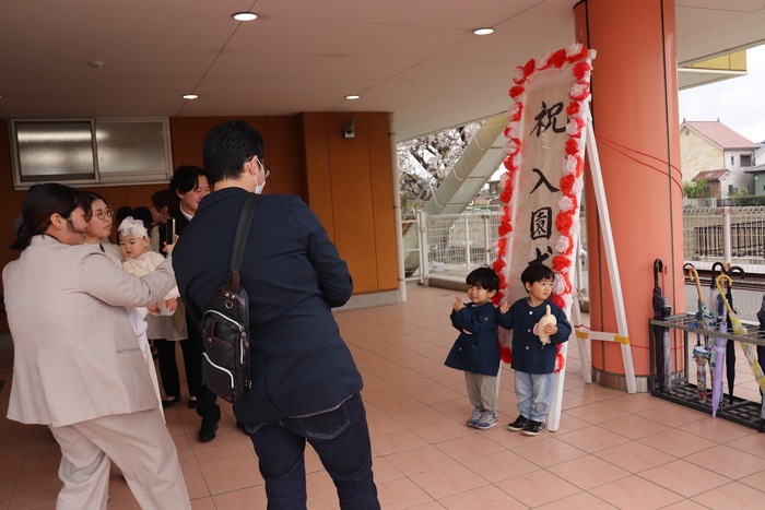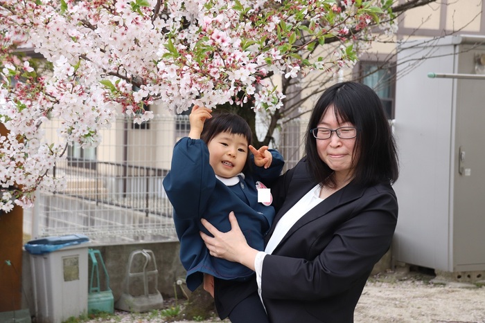 式が終わったら桜の下でこ~んな姿も。 明日から保育園で楽しく過ごしてね! | ||