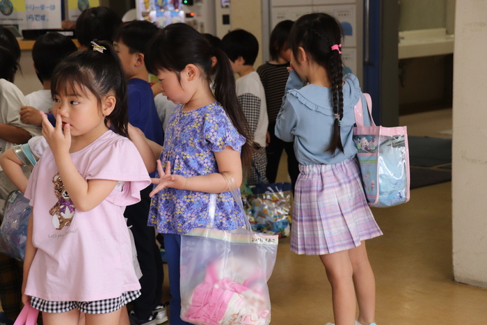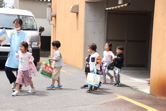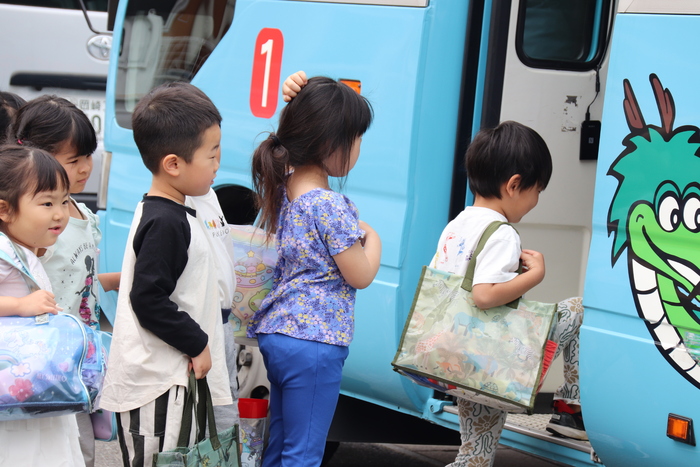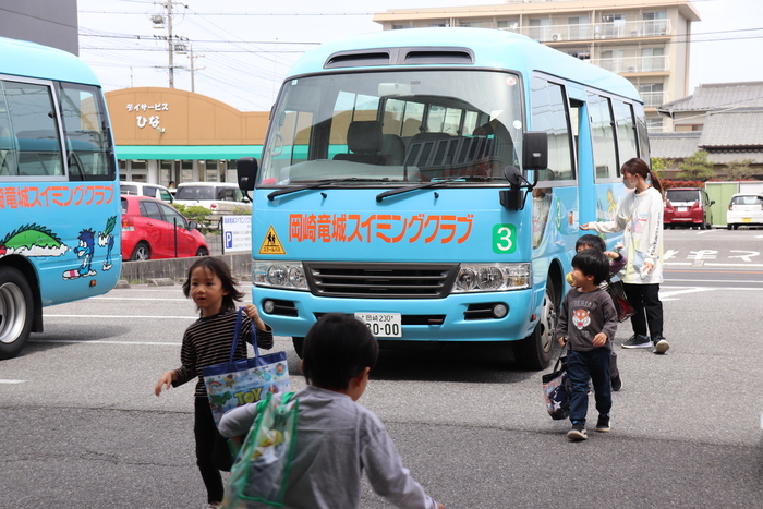 < 4月22日(水)「スイミング」> コロナ禍で中断して以来ですから・・・何年ぶりでしょう・・・。 スイミングを再開しました!! 目的は・・・ 1 心身の発達。 2 水泳への苦手意識をなくし、水に親しめるようにすること。 そして・・・ 3 川や湖、海で危機に遭遇しても自分の命を守れること! (左)バスでの出発にうれしそう!遠足みたいだね。(笑) (右)着きましたよ! | ||
