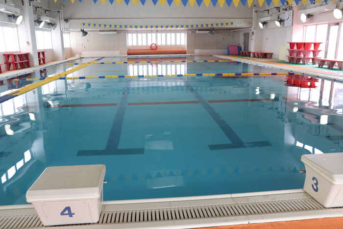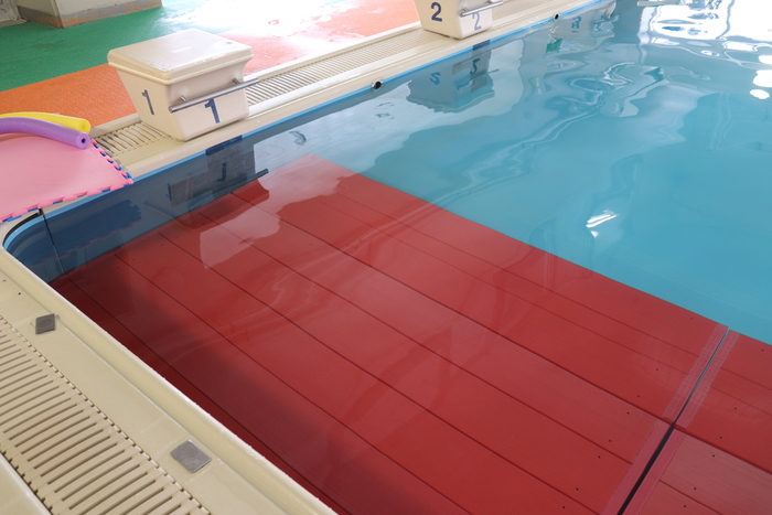 (左)プールはこんな感じ。 お友だちが見たら「うわぁ~!」ってびっくりしちゃいそう。(笑) (右)プールは深いので、保育園の子はこんなふうに赤い台の上で行います。 | ||