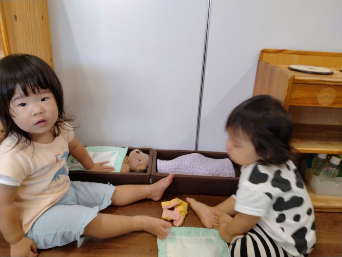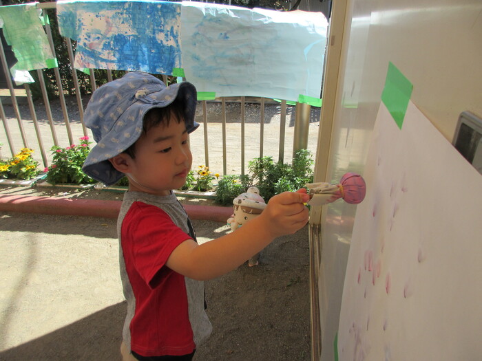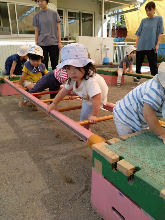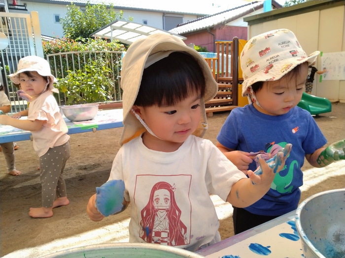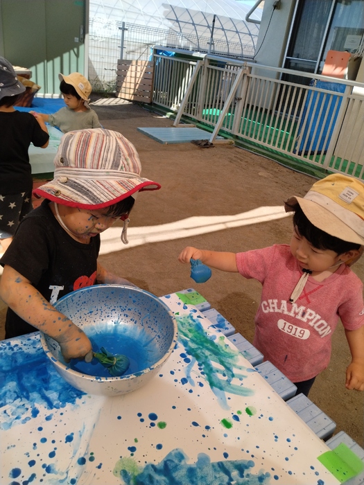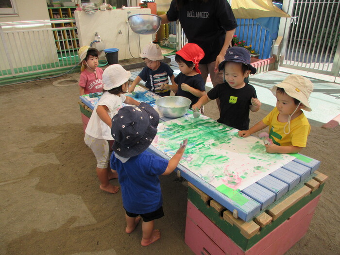 プール遊びも終わりを迎え、夏のあそびを十分に楽しみました。 2歳児と一緒にやった絵の具あそびでは負けないくらい大胆に色付けをしています。 巧技台を出した時には、足をしっかりと上げて上手に渡る姿に成長を感じますね。これから散歩に出掛けたり、沢山身体を使って遊んでいきます。 | ||