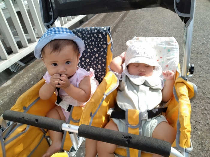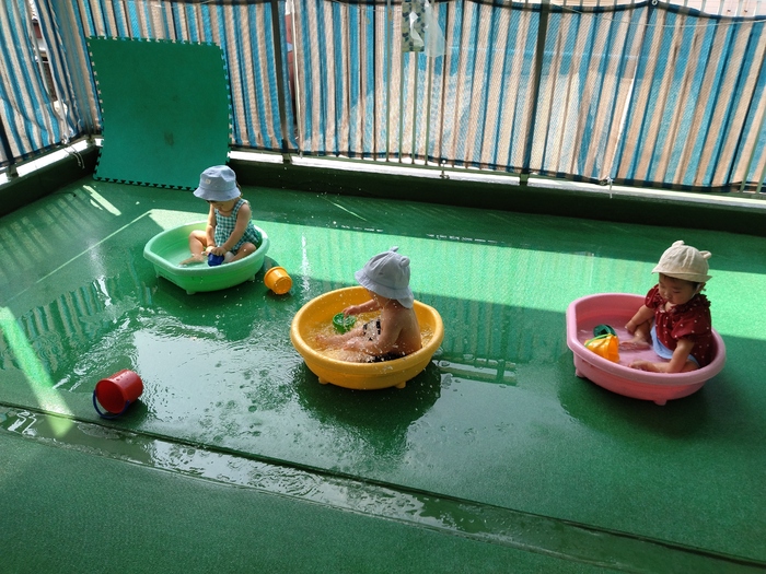 9月上旬はまだ暑かったので、タライに入って水遊びを楽しみました。 すっかり慣れた様子で気持ちよさそうです。 少しずつ園庭にも降りて、砂の感触を味わったり気になった所へ自分で移動する姿も見られています。 時々バギーに乗って公園や近所散歩にも出かけています。 | ||