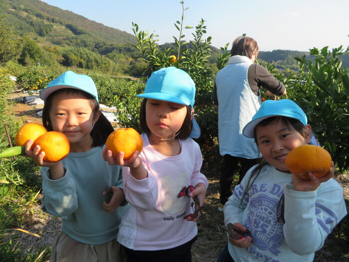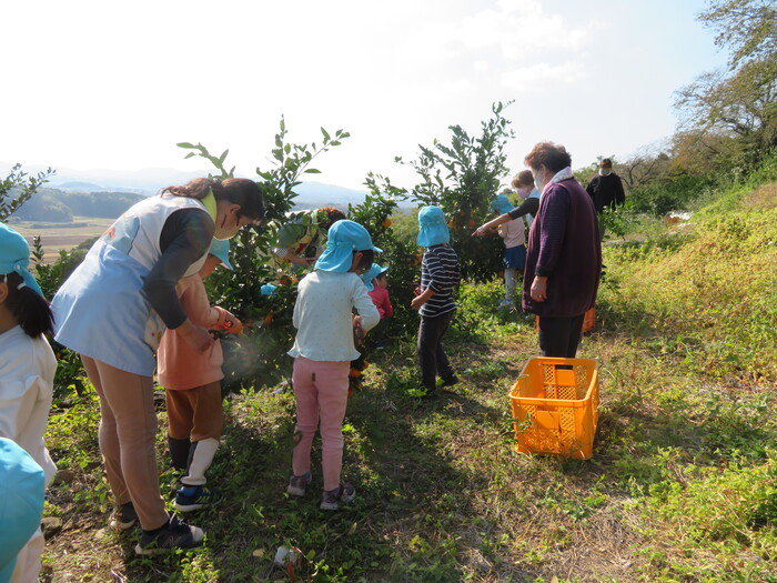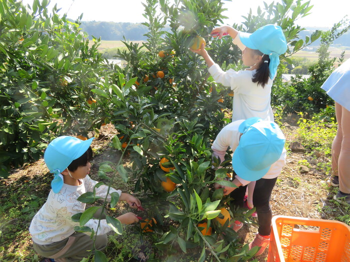 保育園で待ってる みんなのために 張り切ってみかん狩り する年長児。 | ||