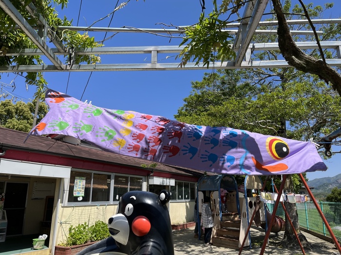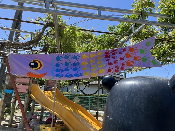 今年もみんなの手形の こいのぼりができました。 園庭で遊ぶ子ども達の 元気な笑い声を お空から見守ってくれています。 | ||