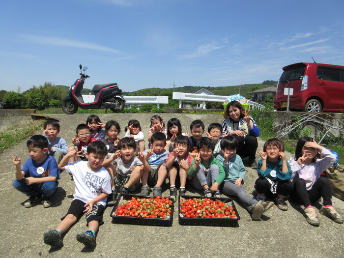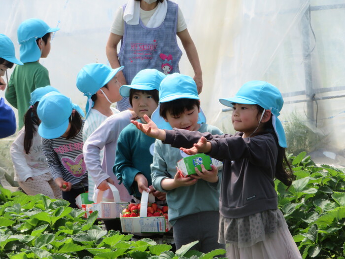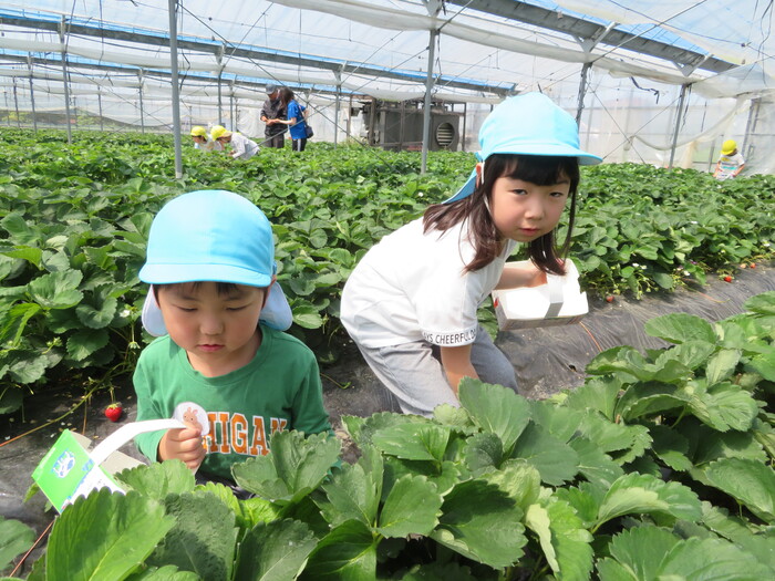 年長児がイチゴ狩りに行きました。 大きいイチゴハウスにびっくり! 汗を流しながら張り切って 収穫してくれました。 | ||