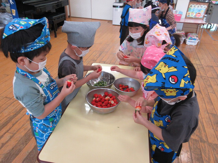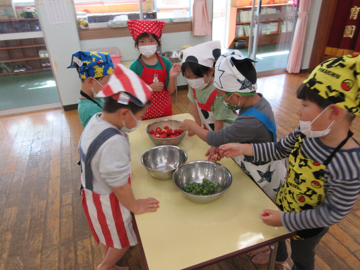収穫したイチゴで イチゴジャム作りと イチゴアイス作りの クッキングをしました。 保育園中イチゴの甘い香りがして みんなウキウキ。 イチゴジャムもイチゴアイスも おいしいとみんなに大評判でした。 | ||