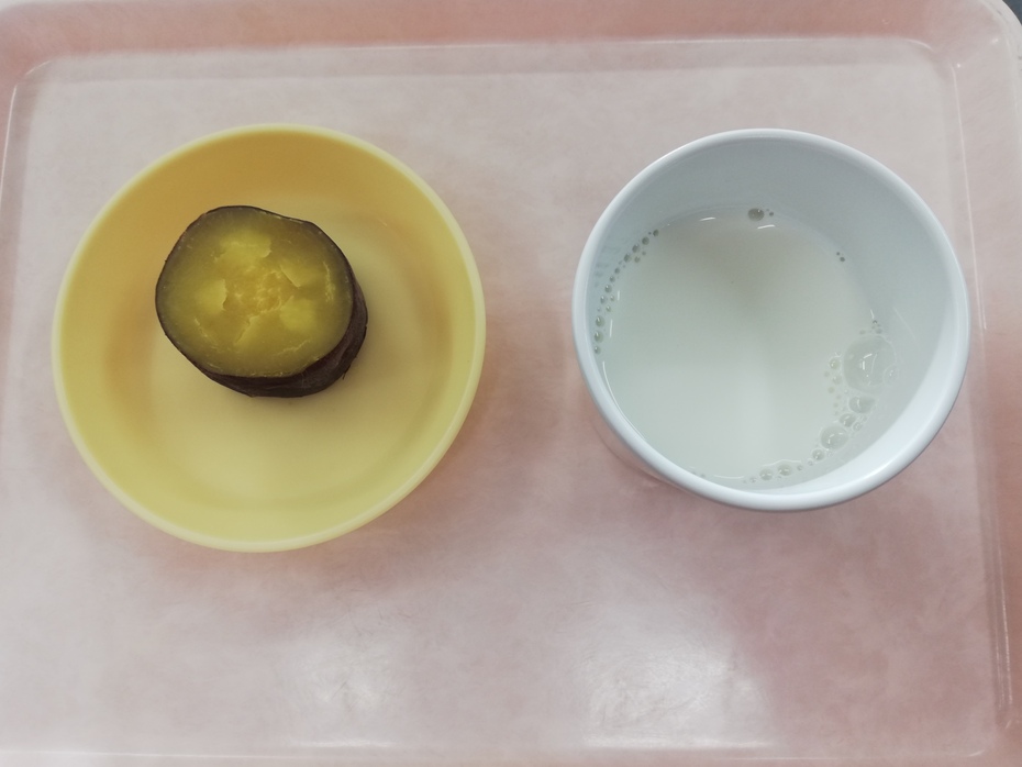 午後のおやつは牛乳とふかしさつまいもです。