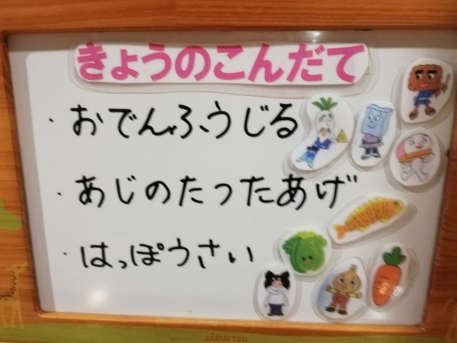 今日の献立はおでん風汁、お魚、旬の白菜を使った八宝菜、そして、お部屋で炊いたご飯です。