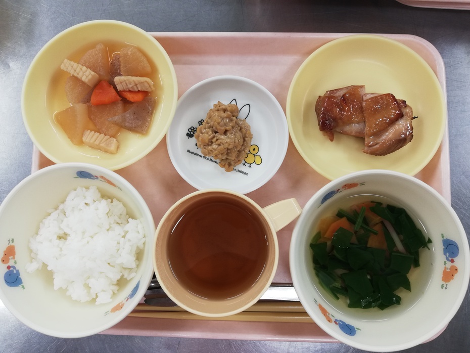鰹節と干し椎茸でだしをとったすまし汁、甘辛のチキン、イカの味が大根にしみた煮物、納豆。