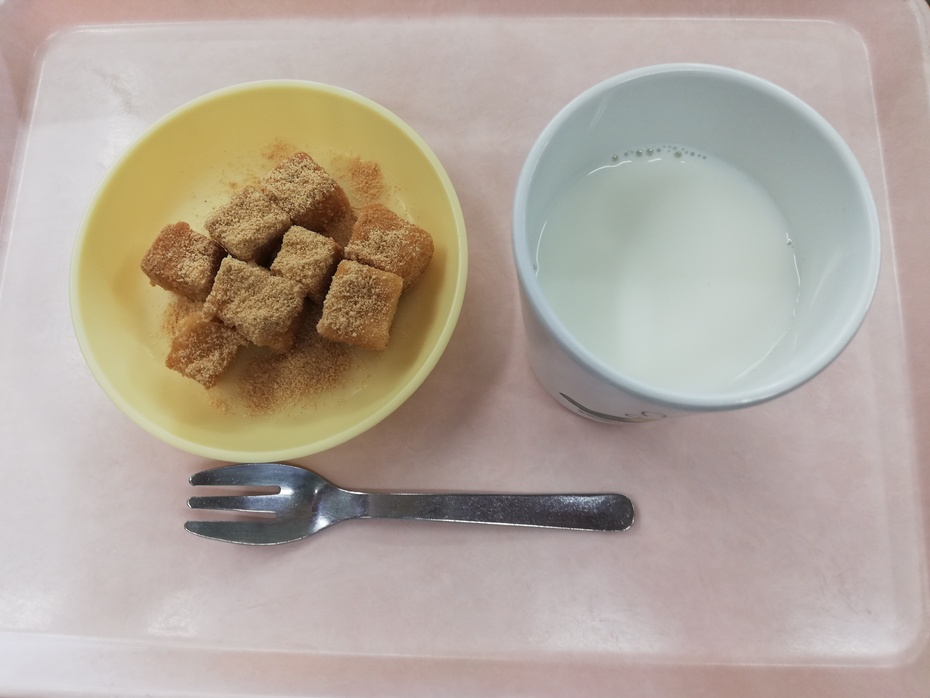 午後のおやつは牛乳と高野豆腐の安部川風です。レシピが欲しいかたは給食室まで(^ー^)