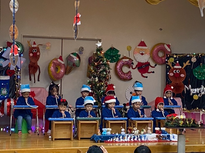 「サンタさんは楽しいことが大好き!!」 ということでふじ組さんが考えてピアニカ演奏(*^^*) 暗いところがいいかも・・・少し部屋を暗くしてキャンドルの明かりをともしたり、 小さいお友達と歌を歌ったり・・・・ サンタさんが来てくれるようにと工夫する子どもたちのところには・・・ やっぱりサンタさんが来てくれました!! | ||