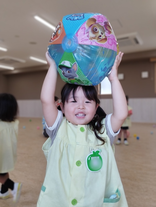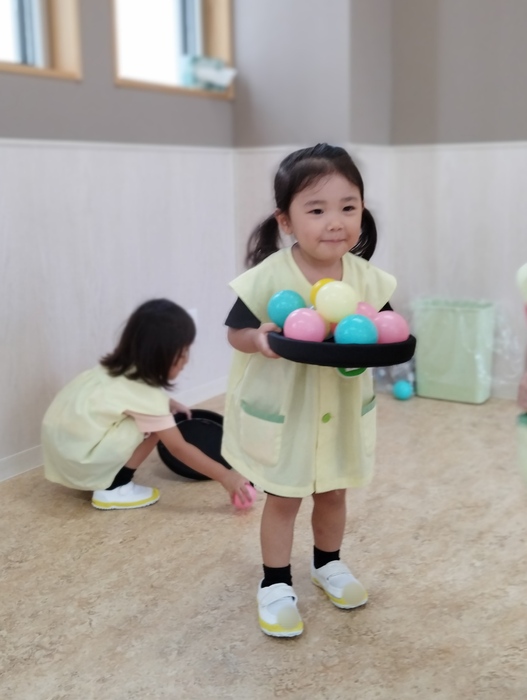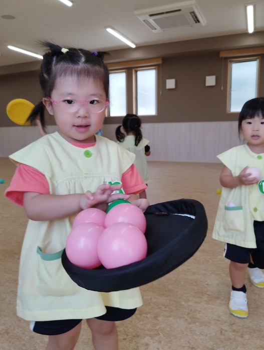 ひよこ組は多目的ホールでボールやフリスビーを使って元気いっぱい遊びました。 広いお部屋を思いっきり走り回ったり、ボールを投げたり集めたり… みんなとっても楽しそうでした✨ | ||