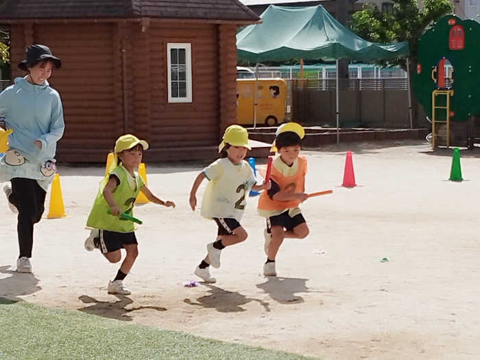 いよいよ明日は運動会! 今日は年長組が園庭でリレーの練習を行いました。 なんと今日は先生チームも加わり、いつも以上に白熱した展開に✨ 他の学年の子ども達も「がんばれー!!」と元気いっぱいの声援を送ってくれていました💛 | ||