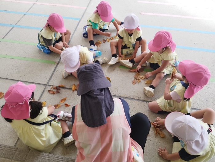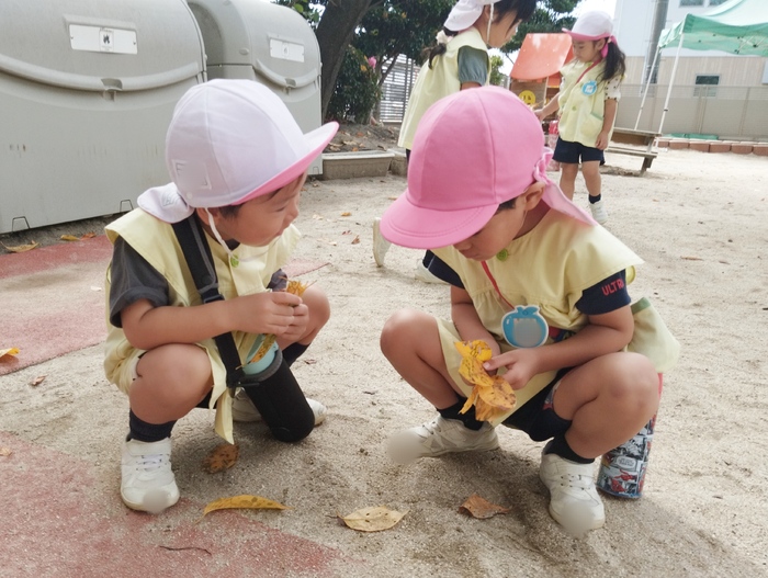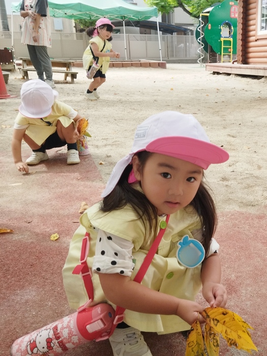 年少組の子ども達が園庭で落ち葉集めを楽しんでいました🍂 手のひらいっぱいに秋を感じながら、夢中になって集めていました🍁 集めた葉っぱで何をしようかな~みんなで見せ合いっこして 楽しそうにおしゃべりしていて可愛かったです♬ | ||