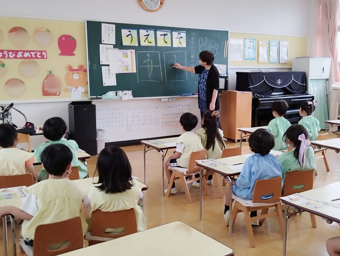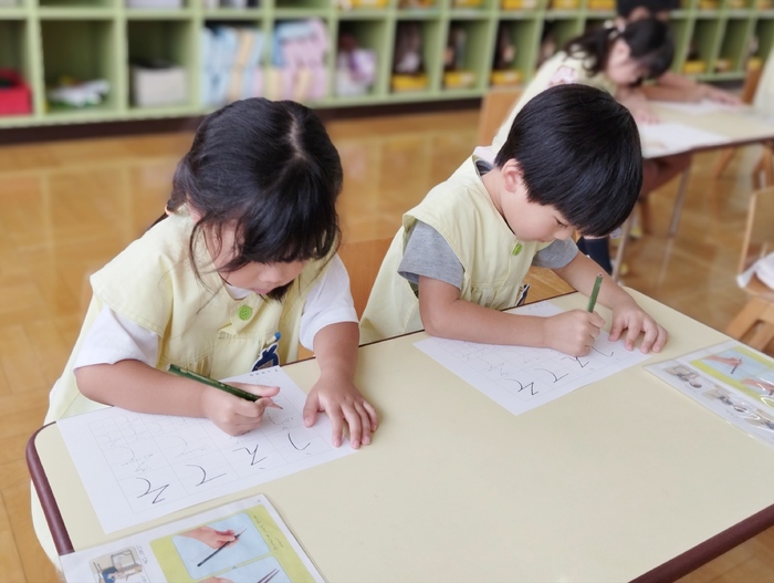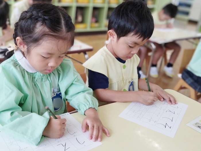年中組は硬筆の先生にお越し頂き、平仮名の練習をしました。 子ども達は鉛筆をしっかり持って、真剣な表情で一文字ずつ丁寧に書いていました。 書いた文字を先生に見てもらい、「上手に書けたね~!」と花丸をもらっていました(*^-^*) 子ども達は花丸をもらってとても嬉しそうな笑顔でした。 この調子で無理なく楽しみながら基礎にしっかり取り組んでいきたいと思います。 | ||