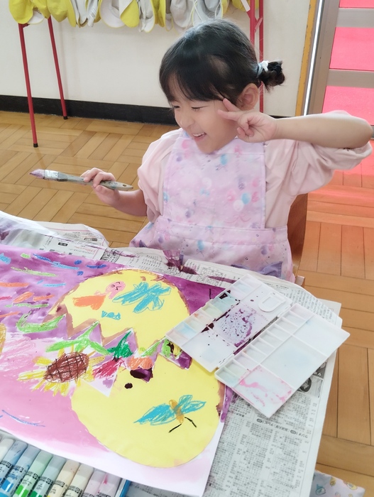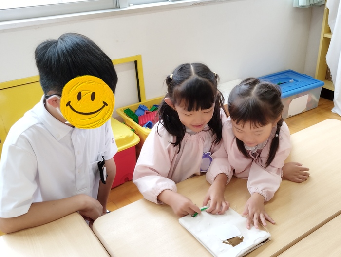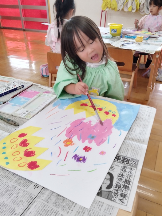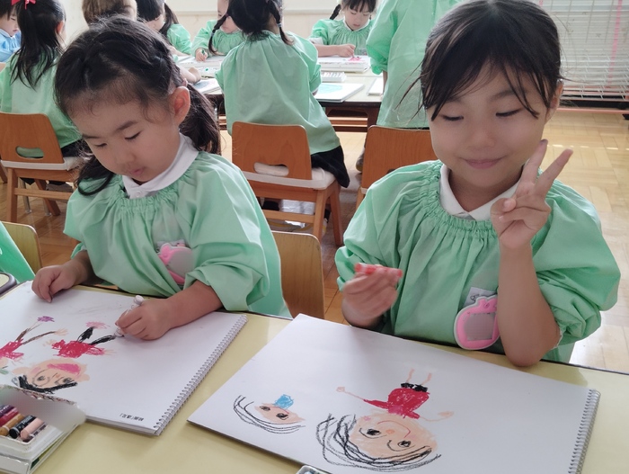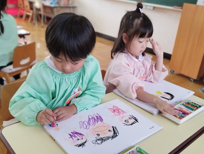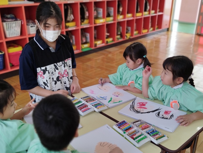 今日から大学生が実習に来てくれています。 外遊びでは子ども達と一緒に元気いっぱいに鬼ごっこをしたり、 教室では活動を見守ってくれてたり給食を一緒に食べたりと、 子ども達と楽しい時間を過ごしてくれています。 年少組は先日の親子遠足の絵を描いていました。 「パパとママと行ったよ~!」 「メリーゴーランドに乗ったんだぁ♪」 「アイスクリームも食べて美味しかったよ~🍧」 などと、楽しかったことを思い出してお話しながら描いていました♪ | ||