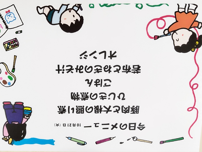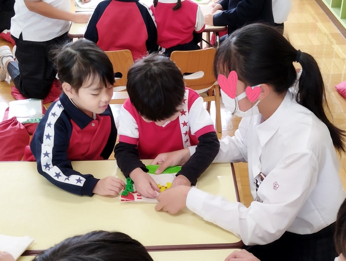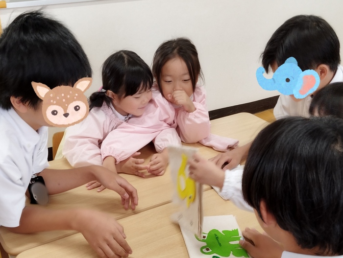 今日から3日間、大治中学の2年生が家庭科の授業で作った手作りの絵本を持って来園してくれます。 絵本には心のこもったイラストや、仕掛けがたくさん! 今日は2年4組・5組・6組の生徒さんでした。 お兄さん、お姉さんの読み聞かせに、 子ども達は目をキラキラさせながら、夢中になって見ていました。 絵本を通して年齢を超えたふれあいが生まれ、温かい空気に包まれました。 | ||