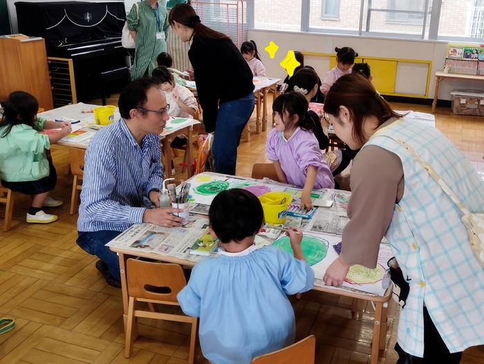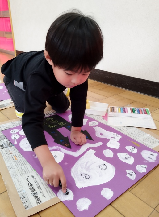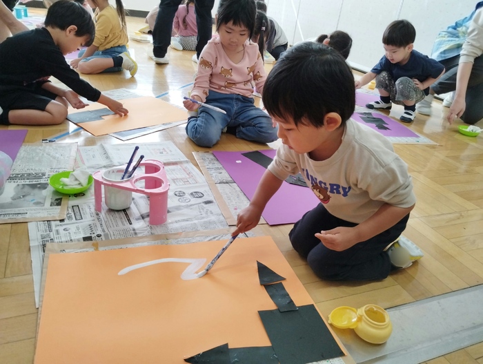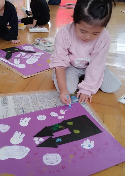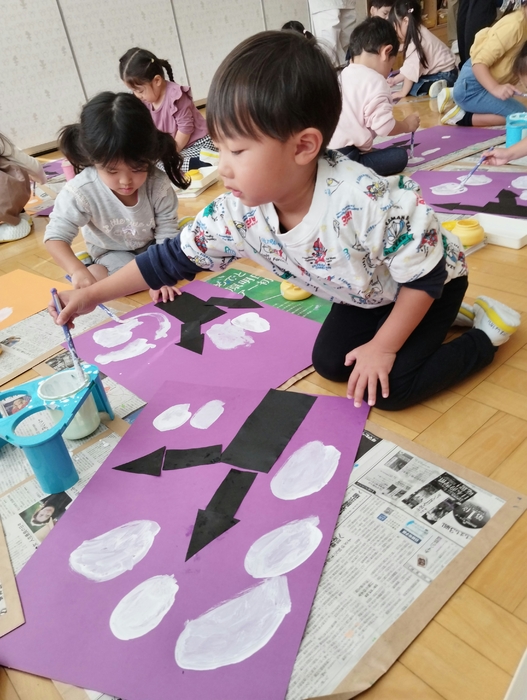 年少組は造形遊びの日でした。 ハロウィンが近いので、今日のテーマは空を飛ぶおばけです👻 絵の具を使って、可愛くて愉快なおばけ達をたくさん表現しました✨ とても楽しい作品が完成しました(*^-^*) | ||