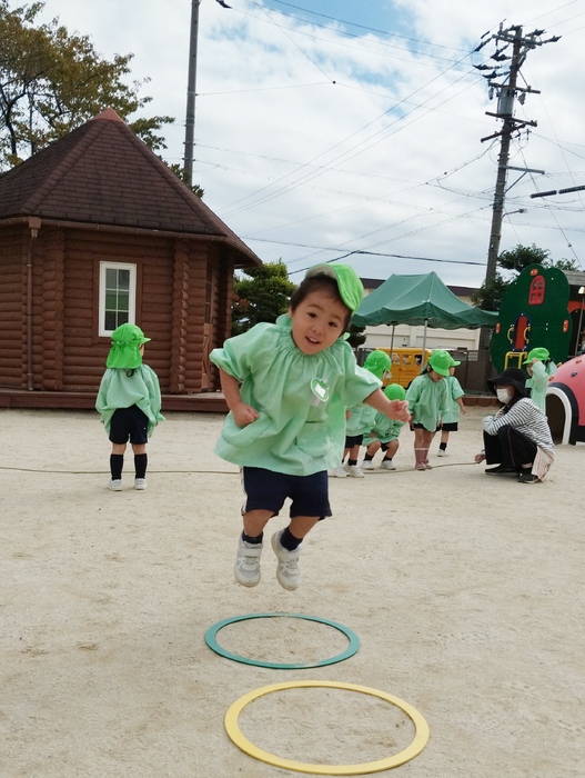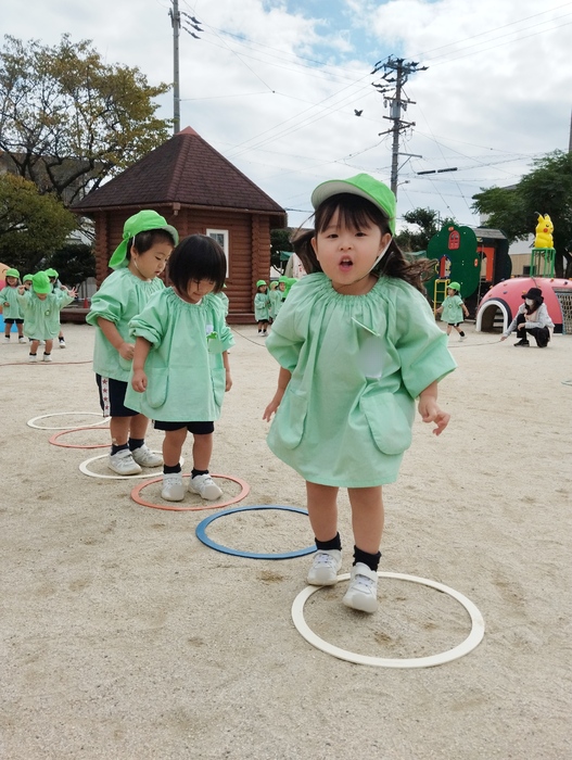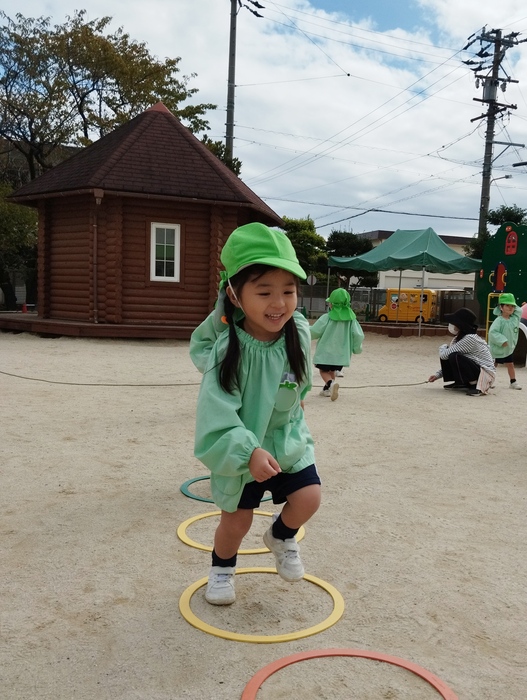 ひよこ組の外遊びの様子です。 今日は縄跳びやフープを使って元気に遊びました☆ | ||