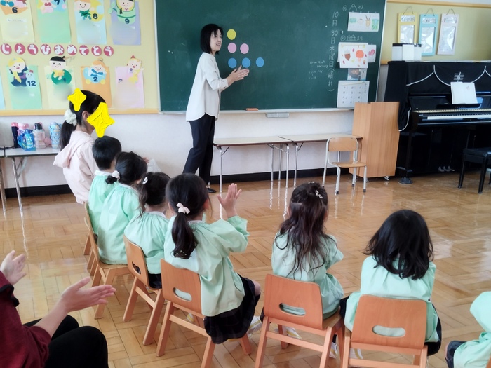 今日は年少組と年中組がリトミックを楽しみました。 年少組は歌に合わせて音に反応し、音の高低や音符の長さの聴き分け、 拍と数などの項目を行いました。 年中組は、2拍子トンパで2人組から4人組へ発展させたり、 心唄で曲を意識したり(今日は曲の中の「た」を抜かして歌ってみました)、 歌に合わせて、スカーフや身体を動かして楽しみました♬ 音楽と笑顔があふれる、楽しい時間になりました☆ | ||