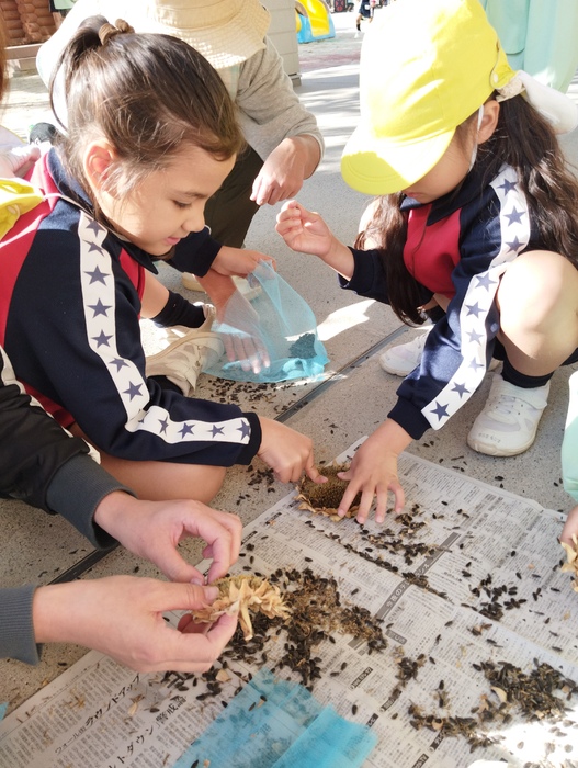 元気に咲いたヒマワリの種を、年長組の子ども達が一粒ずつ丁寧に採ってくれました。 来年また、この種から元気なヒマワリが咲くのが楽しみです🌻 | ||