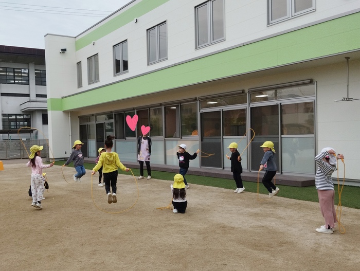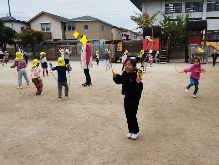 朝の外遊びの時間、園庭では年長組の子ども達が縄跳びの練習に励んでいました✨ たくさん跳べるようになりたい気持ちが伝わってきました(*^-^*) | ||