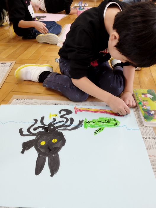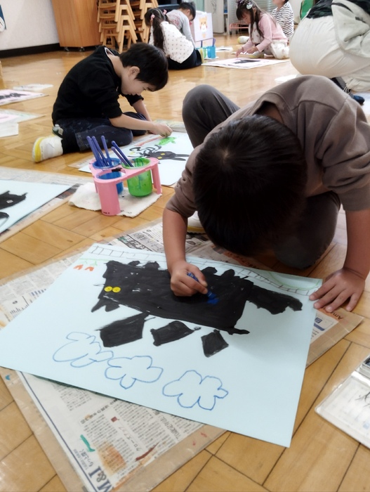 年長組は造形遊びがありました。 今日は「いたずらねこのミロ」の絵本を読んでもらい、 自分だったら何に変身したい?どんないたずらをするかな?と想像を膨らませながら、 絵の具とクレヨンを使って自由に描いていきました🐈 子ども達の発想はとてもユニークで、絵の中には生き物だけでなく、 お菓子やロケットに変身するねこも✨ 子ども達の自由な発想が、画用紙いっぱいに広がっていました🌈 | ||