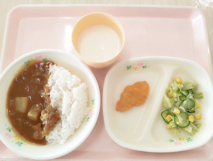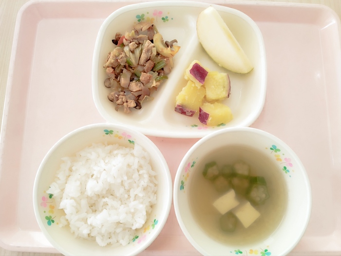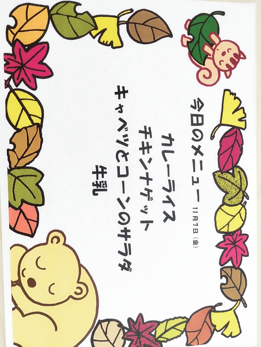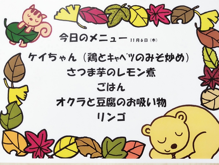 秋晴れの空の下、あひる組と年中組は体育遊びを行いました。 穏やかな晴天の中、広いグラウンドでのびのびと身体を動かす子ども達。 外で元気にみんなで身体を動かす楽しさを味わいました✨ 給食は岐阜県のご当地メニューでした(o^―^o) | ||