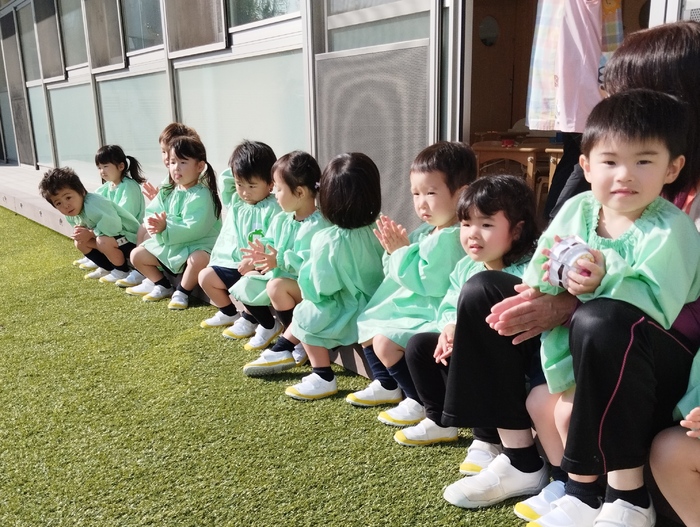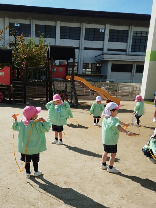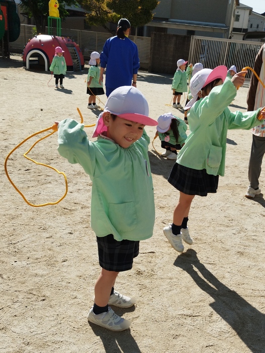 園庭では、年少組の子ども達が縄跳びの練習をしていました。 まずは縄を前後に回す練習。 そして、「ぴょんっ」とタイミングに合わせて跳ぶことに挑戦しながら、 笑顔いっぱいで楽しんでいました☆ | ||