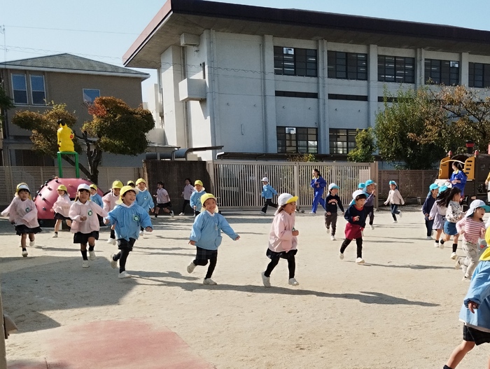 今週から園庭でのジョギングが始まりました。 寒さに負けない丈夫な体を育てることが目的です。 音楽が流れるとみんなとても楽しそうに走り始めました✨ 年長組は園庭を大回りでたくさん走ります。 今日は中学生のお姉さん達も一緒に走ってくれたので、子ども達の楽しさも倍増! これからも寒さに負けず、みんなで楽しく体を動かしていこうと思います(*^-^*) | ||