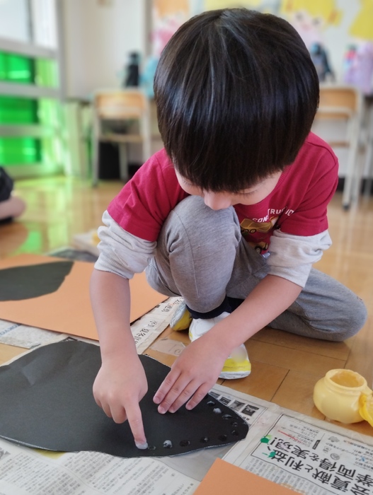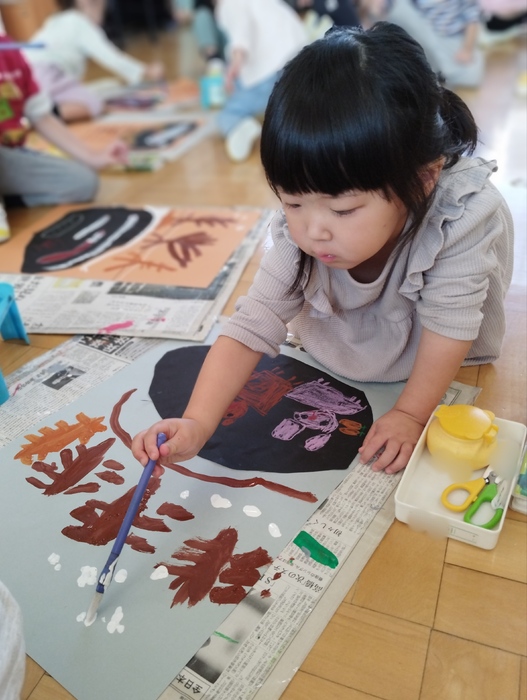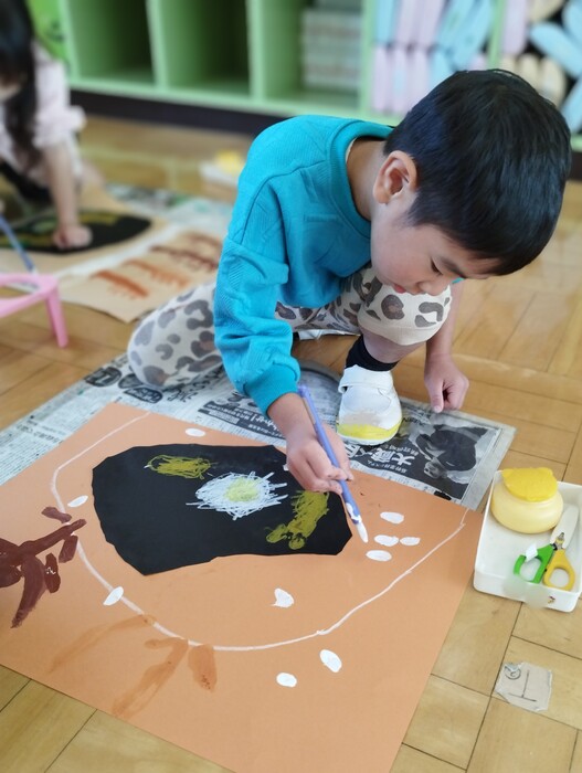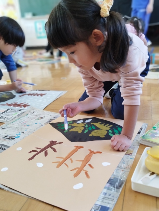 画用紙を切って穴を作り、その中に冬眠する動物たちをクレヨンで描いていきます。 外の景色は絵の具を使って、冬の様子を表現しました。 「くまさんとりすさんが寝てるよ」 「雪が降ってきたね」 など、作品にはたくさんの物語が詰まっていました✨ | ||