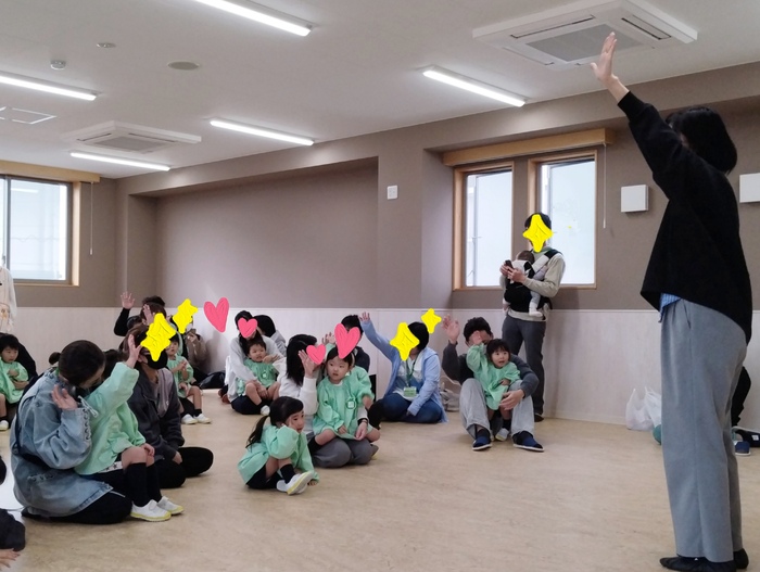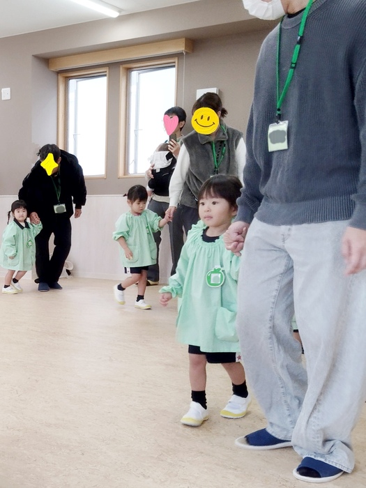今日はひよこ組の参観日でした。 クラスで日課活動をご覧頂いた後、 多目的室で親子リトミックを楽しみました♬ 保護者の皆様がとても協力的で ①導入の「おへんじのうた」から ②音楽に合わせた「お散歩」(止まる・歩く・走る・ゆっくり歩くの聴き分け) ③ブランコとシーソーをイメージし、前後に動いたり揺れたり(速さの違いを経験) ④保護者の膝の上で歌あそび(音の上下に合わせて) ⑤「ことりの歌」に合わせてスカーフ遊び など、親子で一緒に身体を動かしながら、楽しい時間を過ごす事が出来ました(o^―^o) | ||