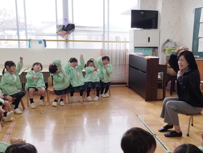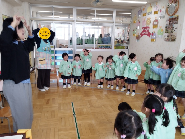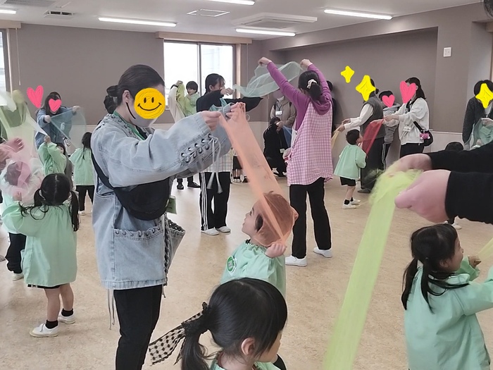 年少組と年中組もリトミック遊びをクラスごとに楽しみました♬ 年少さんは、強弱や速遅の経験、拍と数の活動、歌遊びでフレーズの終わりに動物の模倣、 年中さんは、2人組の活動から始まり、心唱、スカーフを使っての音階表現など 綺麗な音楽に合わせて楽しい時間を過ごす事が出来ました。 どのクラスも子ども達の可愛い笑顔がたくさん見られました✨ | ||
