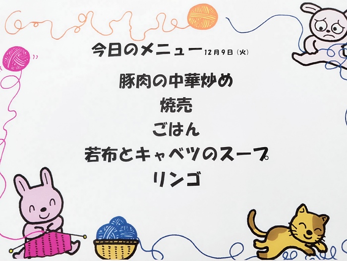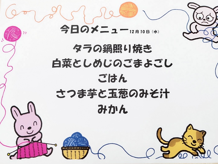 今日はまなびタイムがありました。 どのクラスも笑顔いっぱいで楽しく活動できました☆ 給食は旬の食材をふんだんに使った薬膳料理でした。 フワフワした柔らかい身が特徴の「タラ」・ 大根・豆腐に並び、冬の健康維持に欠かせない養生三宝の一つ「白菜」・ からだの調子を整えるビタミンやミネラルが含まれた「みかん」など。 食べやすい味付けで、栄養もしっかりとる事が出来ました(o^―^o) | ||
