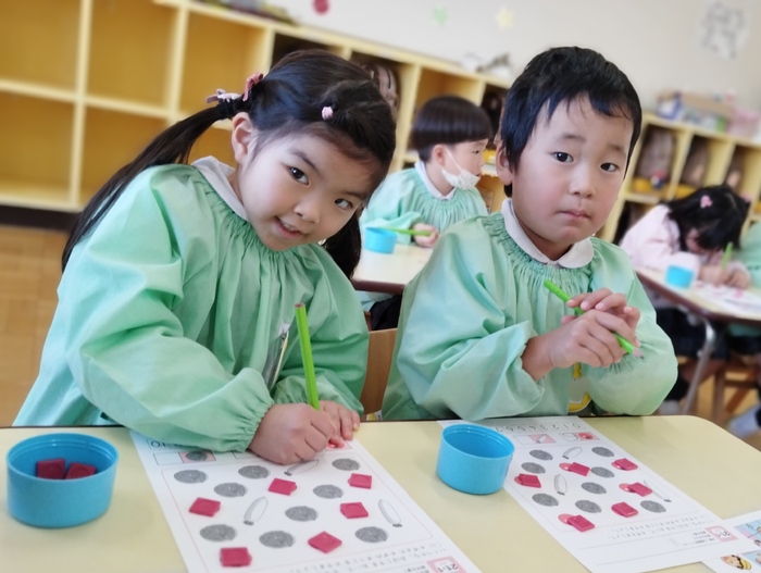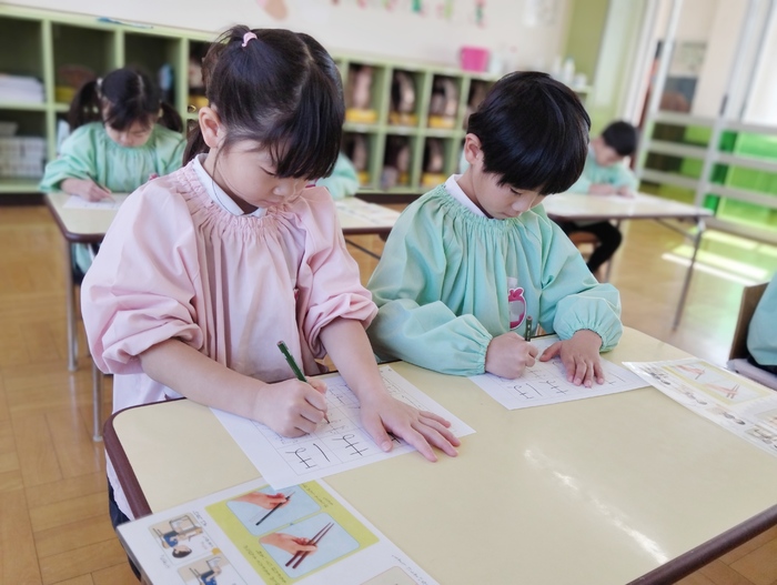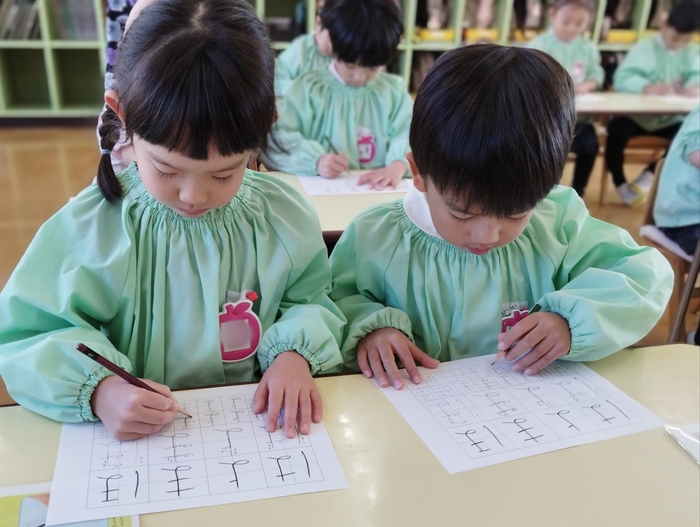 今日、年中組は硬筆の先生にお越し頂き、硬筆練習をしました。 だんだんと難しいひらがなになってきましたが、 講師の先生のお話をよく聞いて、お手本を見ながら 集中して取り組んでいました✍ | ||