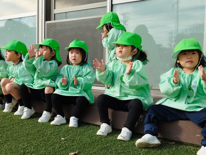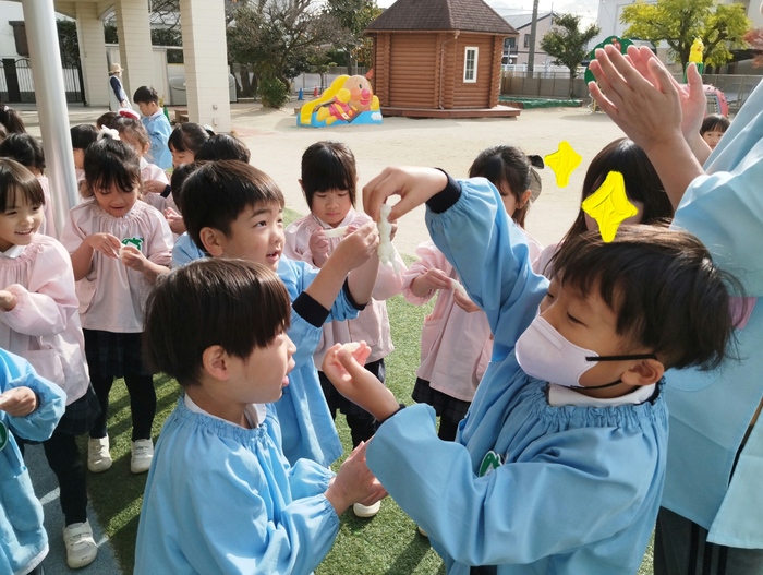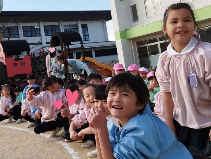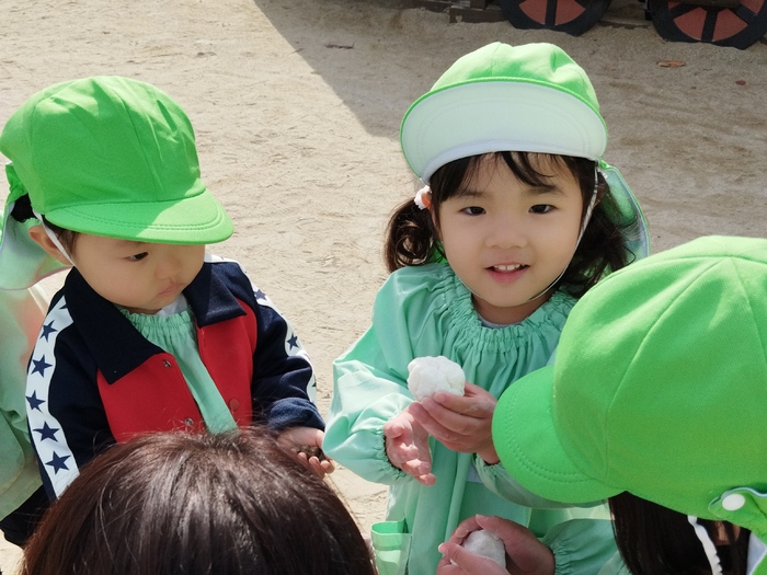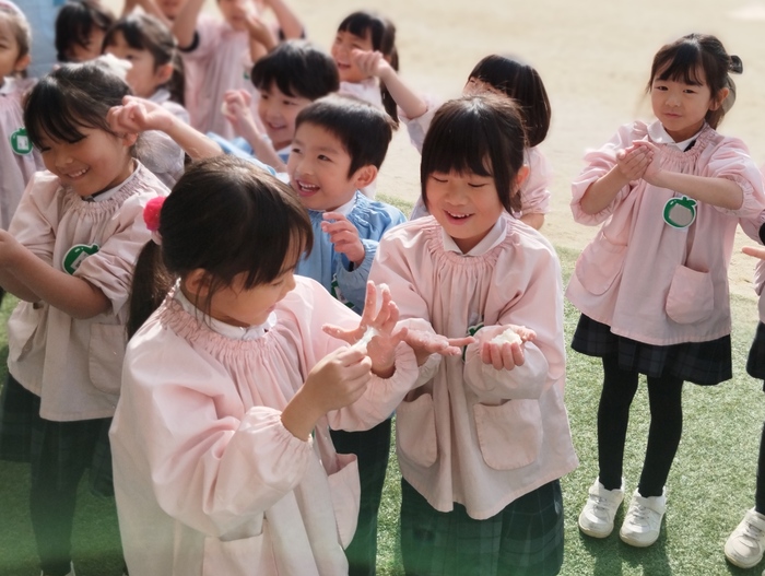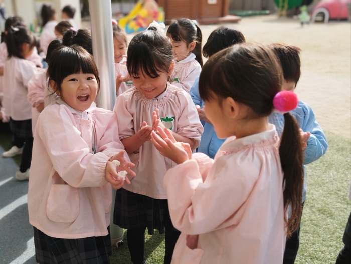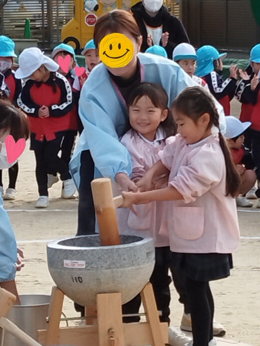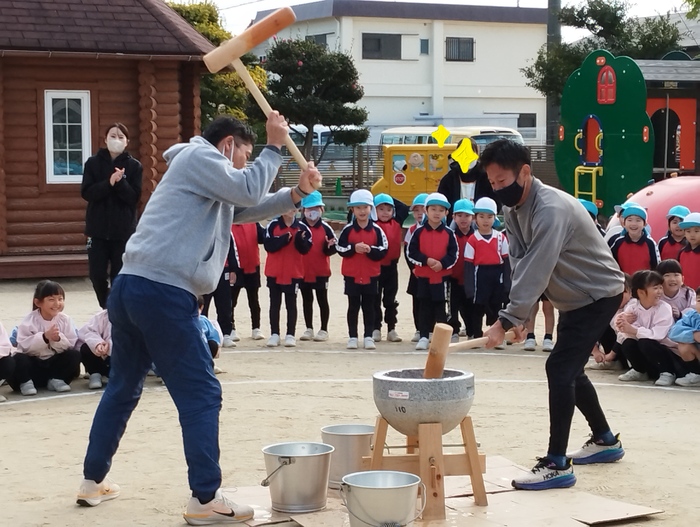 年長組の子どもたちは先生と一緒に杵を持ち、 ぺったんぺったん餅つき体験! 他の学年の子ども達は そばで元気いっぱい応援しながら見守ります📣 「よいしょ~!よいしょ!!」 「も~ちつ~き~♪ぺったんこ♪」 掛け声や可愛い歌声が響き渡り、 園庭はとても楽しい雰囲気に包まれました(*^-^*) 体育の先生の、力強くて速い餅つきには、 子ども達からひときわ大きな歓声が上がっていました✨ | ||