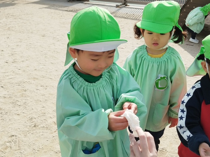 もち米が少しずつお餅に替わっていく様子を目の当たりにし、 子ども達は実際に手で触ったり伸ばしたりして、その感触を楽しみました。 衛生面に配慮し、園庭で餅つきを楽しんだお餅は 鏡餅にして幼稚園に飾りました✨ | ||