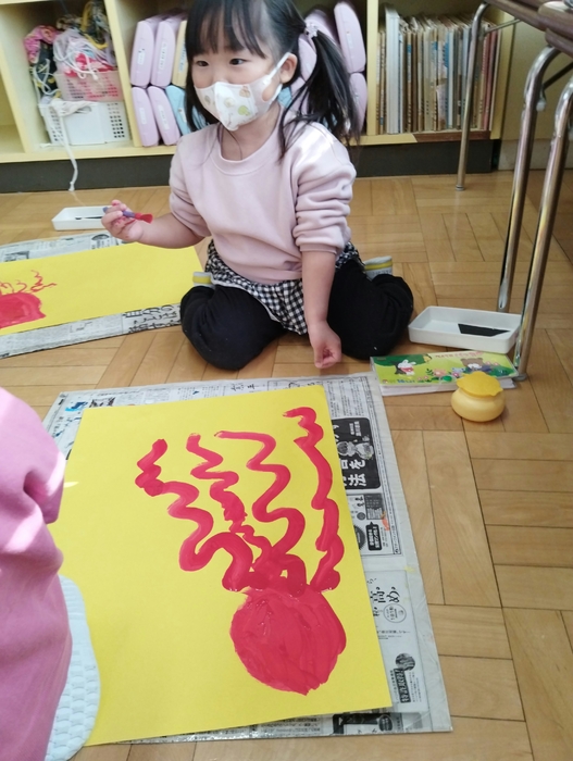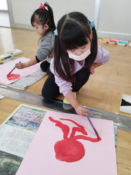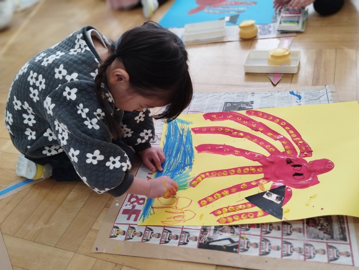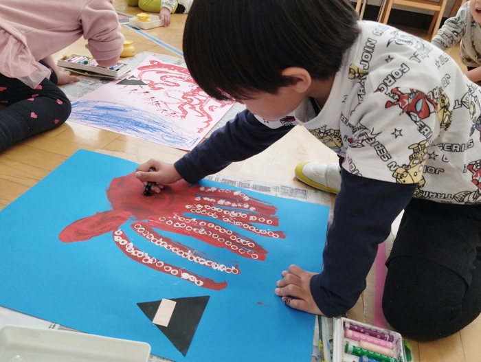 年少組は造形遊びの日でした。 今日はまず絵の具を使ってダイナミックに「たこ」の絵を描いていきます。 鉛筆のキャップを使って吸盤も上手に表現しました。 その傍らにいるのは、絵本で見た「おにぎりにんじゃ」‼ 楽しそうな個性あふれる絵がたくさん完成しました👏 | ||