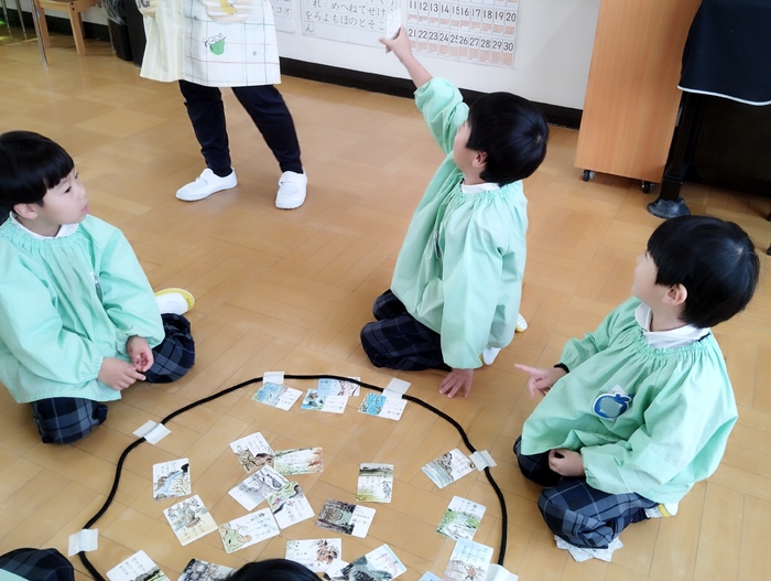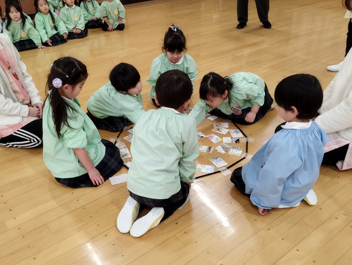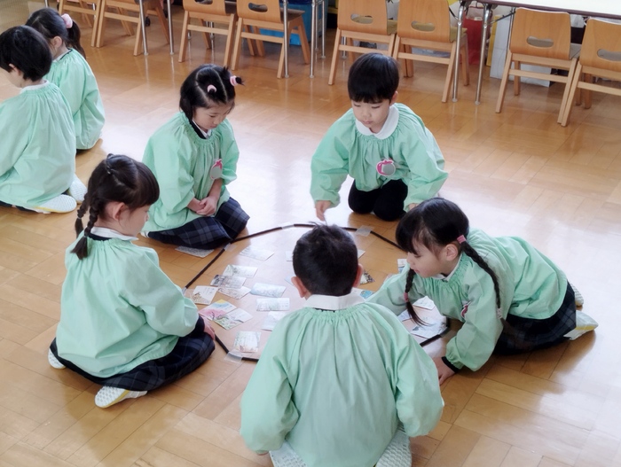 かるた大会最終日。 今日は年中組が俳句かるたで行いました! 「はいっ!」と元気な声と共に、素早く手を伸ばす姿に成長を感じます✨ 友達と競い合いながらも、認めあったり、励ましあったりと、 温かい雰囲気の中で最後まで楽しむ事が出来ました(*^-^*) | ||