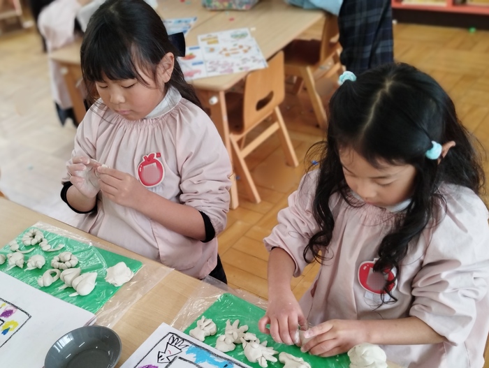 年長組では、作品展に向けての制作活動が始まり、 今日は粘土を使って自分の「好きな物」を自由に表現していました。 これからどんな作品になっていくか、楽しみですね♪ | ||