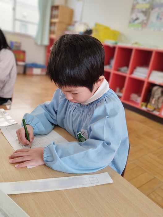 年長組は硬筆の先生にお越しいただき、カタカナに取り組みました。 以前に習った復習でしたが、さすが年長さん👏 「どの字が一番かっこいいかな?」などクイズにも しっかりと手を挙げて正解できていました✨ 先生の話をしっかりと聞き、一文字一文字、心を込めて丁寧に描く事が出来ていて、 小学校に向けた準備も着々と進んでいるように感じました🌸 | ||